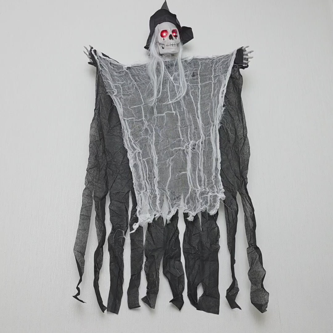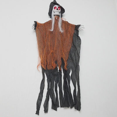 Perfect for hanging on porches, in doorways, or as part of a haunted house setup, the Creepy Cackler fills the night with her sinister laugh while swaying in the breeze. She’s scary, spooky, and guaranteed to be the life (or afterlife!) of your haunted scene.