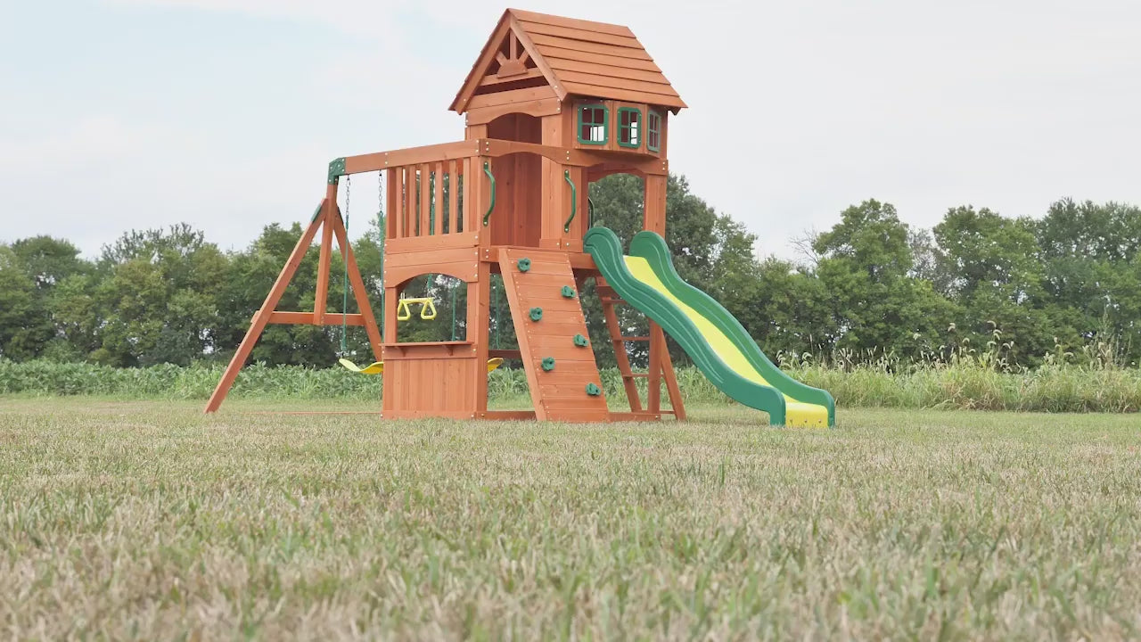 The Atlantis wooden swing set is chock full of features but still fits in smaller yards. It has an awesome upper clubhouse with bay windows and balcony. Down below there's room for a sand box and a snack / activity shelf lets kids play and sip some refreshments at the same time. A flat step entry ladder and solid rock wall allow climbing to be easy or challenging. The 8' speedy slide is safe and fast. There are two belt swings and a trapeze so three can swing at once. This kids' swing set will be fun for Year to come!