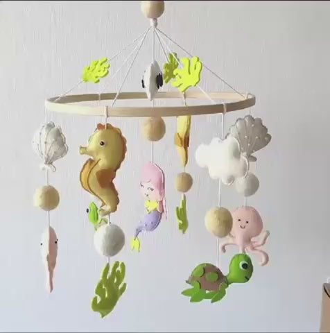 This mobile features the Tortoies, Shells, Starfish, Octopus, Sea weed, Seahorse and a Mermaid. Each of the elements are attached to the wooden ring using cotton thread.
