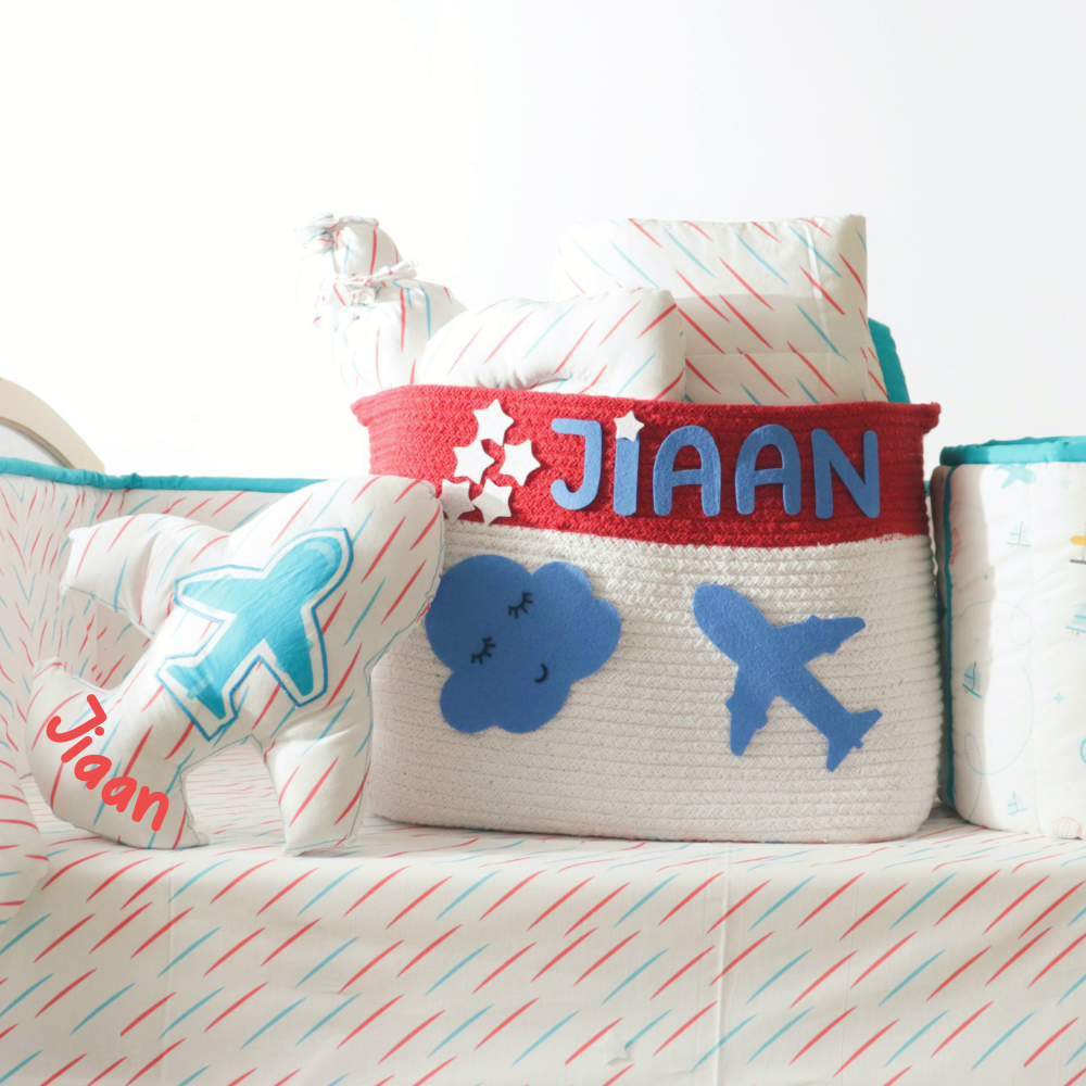 SIZE & MAKE- 100% GOTS Certified Organic Cotton & Cotton Muslin, generously sized with elegant designs- 1 Large Cotton Rope Basket - 40 x 30 x 30 cm, 1 Medium Cotton Rope Basket- 30 x 20 x 20 cm, 1 Reversible Quilt - 110 x 90 cm, 1 Reversible Quilted Cot Bumper- 400 cm x 30 cm, 1 Cot Bedsheet- 140 x 105 cm, 1 Pillow- 20 cm long x 23 cm wide, 2 Bolsters - 45 cm long x 32 cm wide each, 1 Reversible Blanket- 110 x 110 cm (3 layers),1 Swaddle- 105 x 105 cm, 1 Reversible Baby Bib- 37 cm long x 22 cm wide (3 layers), 1 Reversible Burpy Cloth- 60 cm long x 25 cm wide (3 layers), 1 Wipe- 30 x 30 cm (2 layers), 1 Shape Cushion, Rocket- 36 x 20 cm.